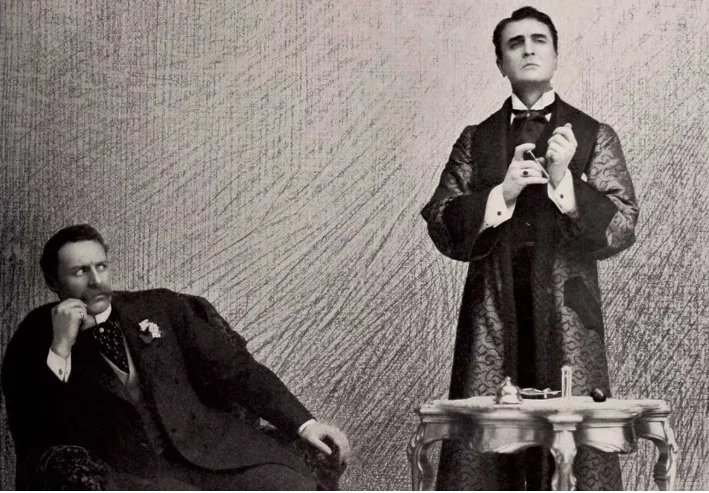 Sherlock Holmes, played by William Gillette, and his hypodermic. From a stage adaptation of Sherlock Holmes at the Garrick Theatre, London, 1899.